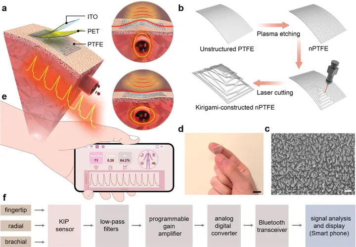 Continuously and accurately monitoring pulse-wave signals is critical to pre- vent and diagnose cardiovascular diseases. However, existing wearable pulse sensors are vulnerable to motion artifacts due to the lack of proper adhesion and conformal interface with human skin during body movement. Here, a highly sensitive and conformal pressure sensor inspired by the kirigami struc- ture is developed to measure the human pulse wave on different body artery sites under various prestressing pressure conditions and even with body movement. COMSOL multiphysical field coupling simulation and experi- mental testing are used to verify the unique advantages of the kirigami struc- ture. The device shows a superior sensitivity (35.2 mV Pa−1) and remarkable stability (>84 000 cycles). Toward practical applications, a wireless cardiovas- cular monitoring system is developed for wirelessly transmitting the pulse signals to a mobile phone in real-time, which successfully distinguished the pulse waveforms from different participants. The pulse waveforms measured by the kirigami inspired pressure sensor are as accurate as those provided by the commercial medical device. Given the compelling features, the sensor provides an ascendant way for wearable electronics to overcome motion arti- facts when monitoring pulse signals, thus representing a solid advancement toward personalized healthcare in the era of the Internet of Things.